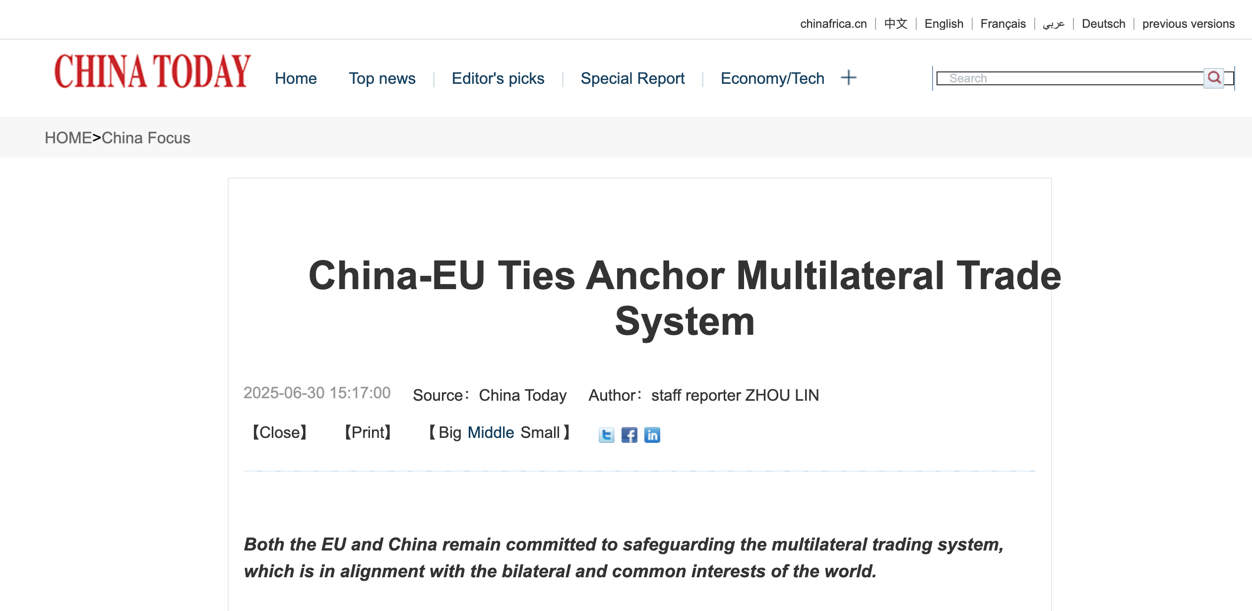 Both the EU and China remain committed to safeguarding the multilateral trading system, which is in alignment with the bilateral and common interests of the world.