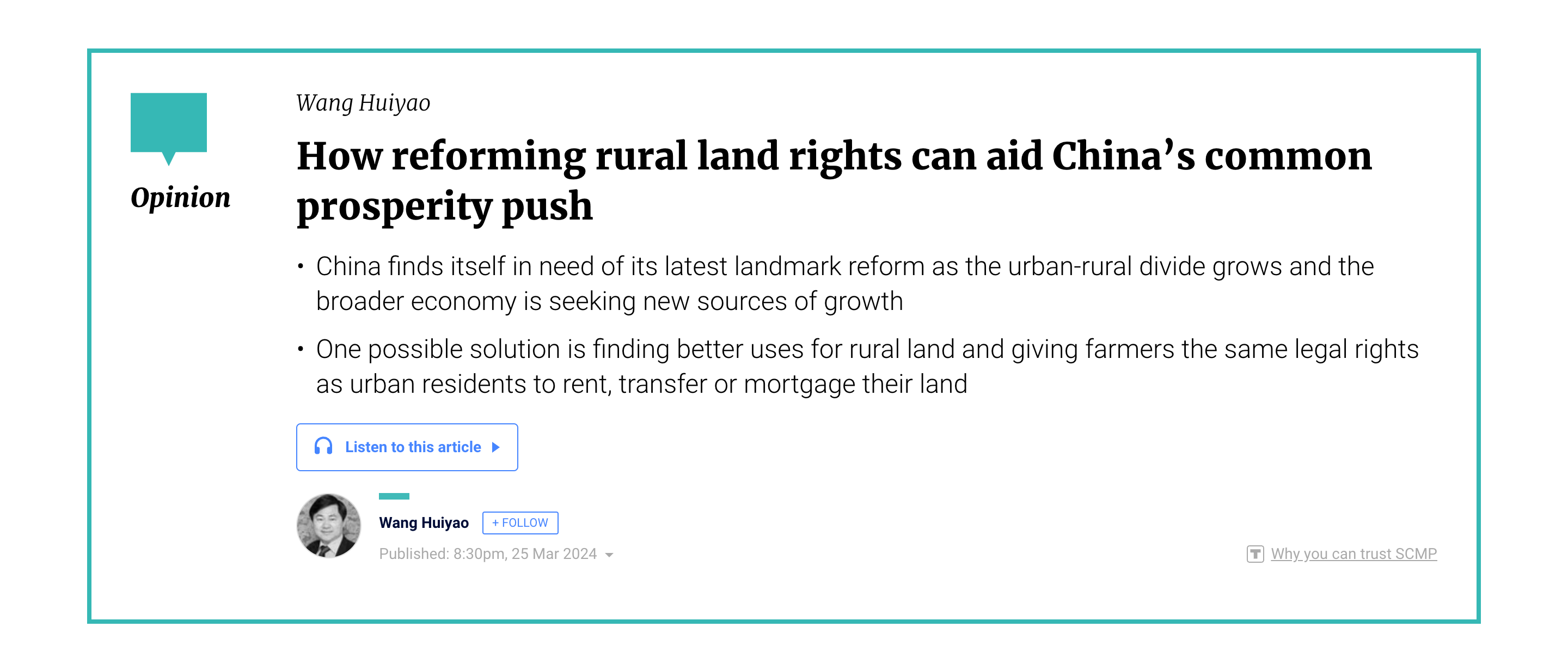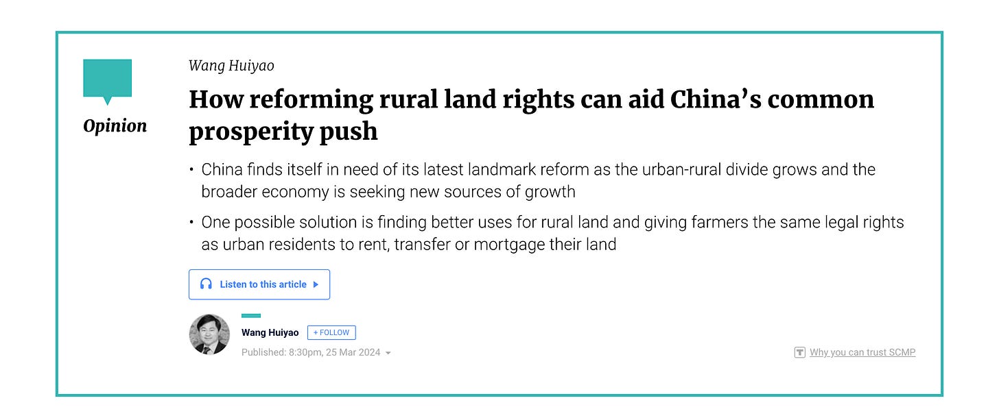Henry Huiyao Wang quoted in SCMP for advocating for rural land reform