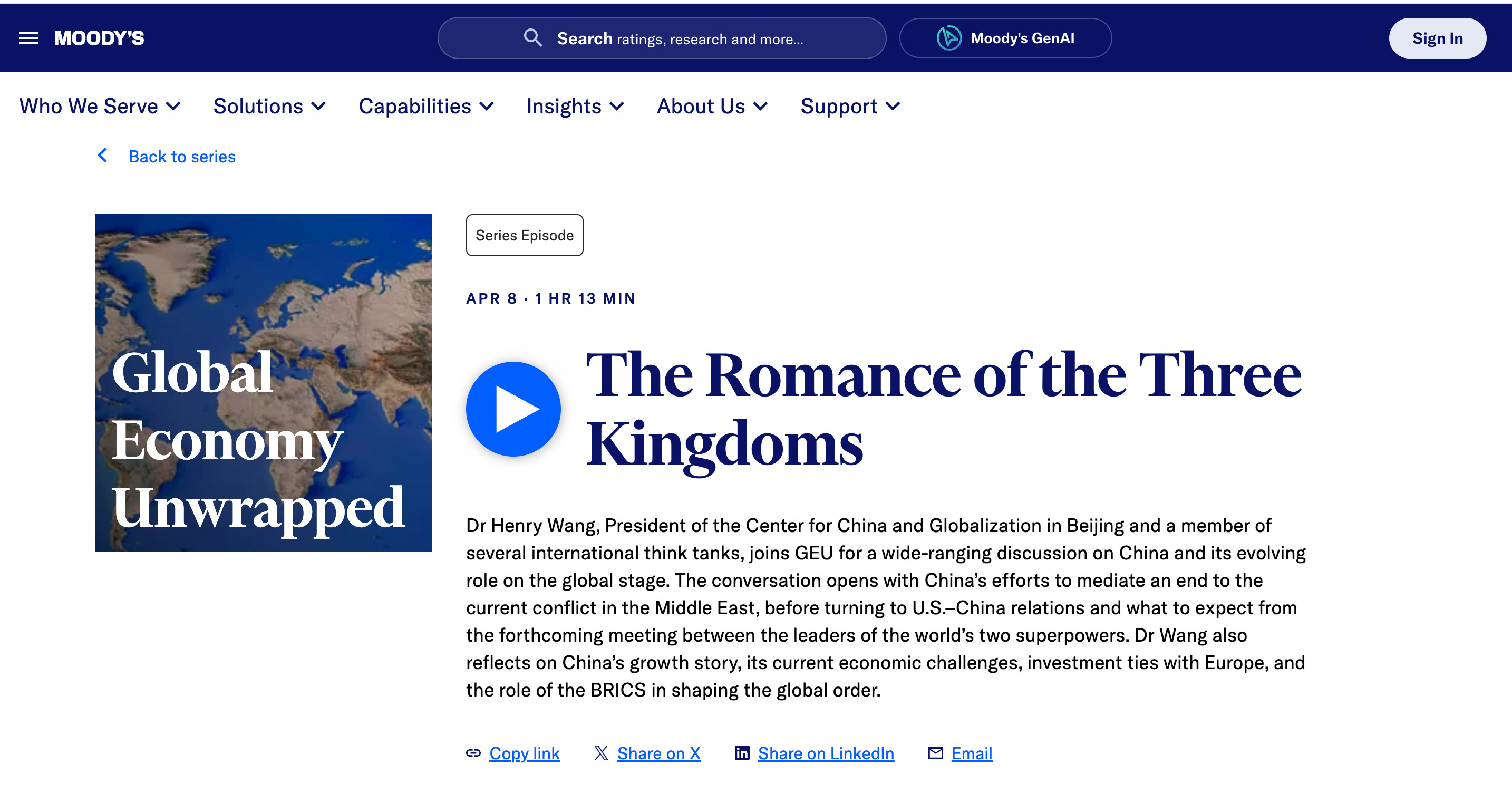 Henry Huiyao Wang joins Moody’s Global Economy Unwrapped: The Romance of the Three Kingdoms
