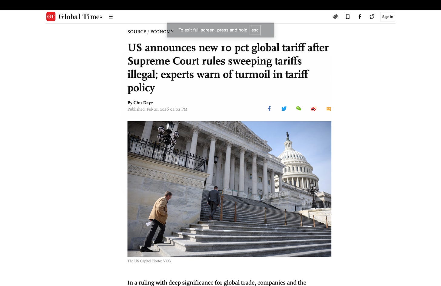 He Weiwen, a senior fellow at the Center for China and Globalization, told the Global Times on Thursday that after the US Supreme Court struck down most of the Trump administration’s tariffs, a period of turmoil in US tariff policy is highly likely.