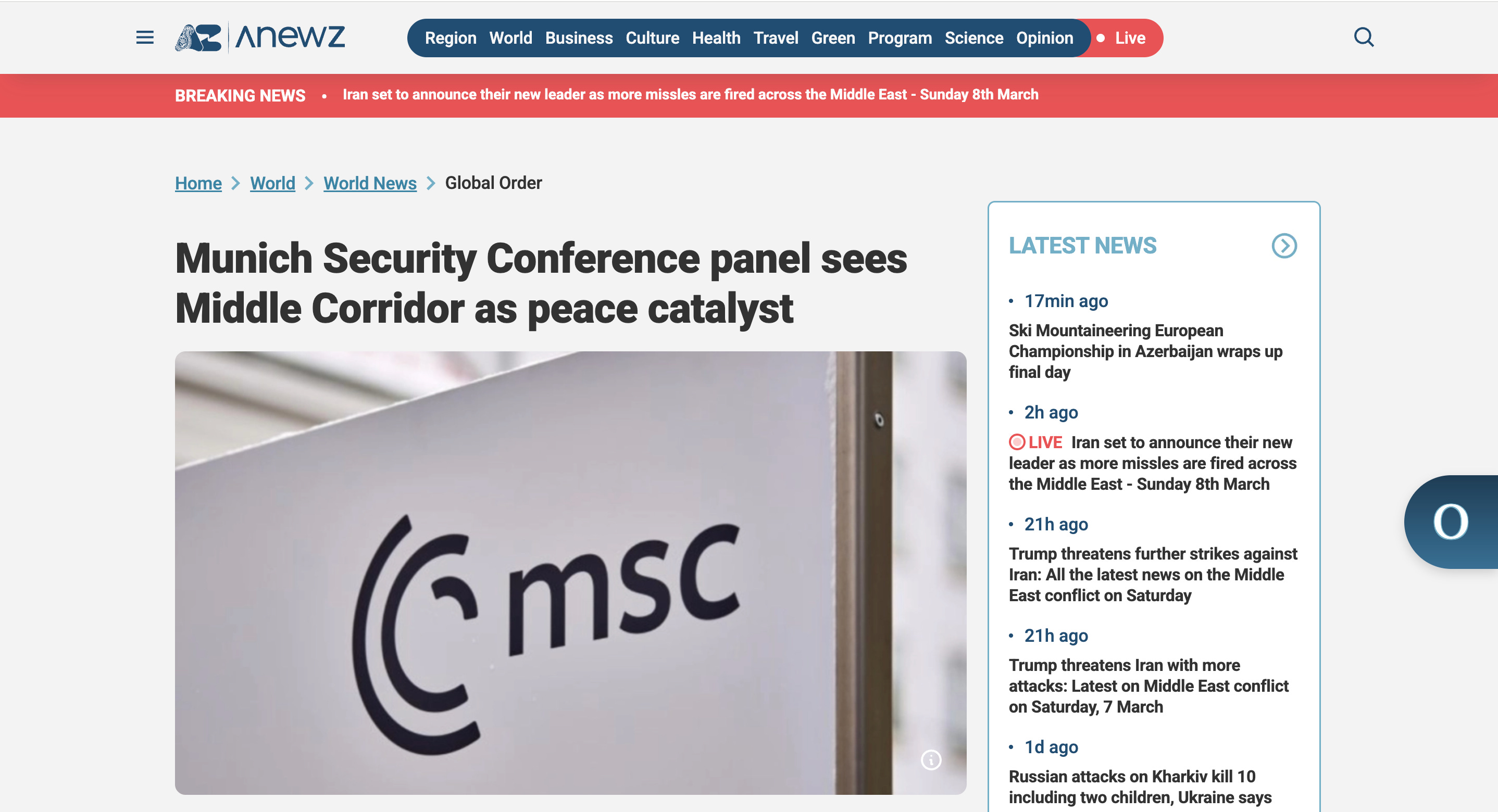 The Munich Security Conference panel on the Trans-Caspian International Transport Route featured President of the Republic of Azerbaijan Ilham Aliyev, European Commissioner for Enlargement and Eastern Partnership Marta Kos, Founder and President of the Center for China and Globalization and former State Counselor of the People’s Republic of China Wang Huiyao.