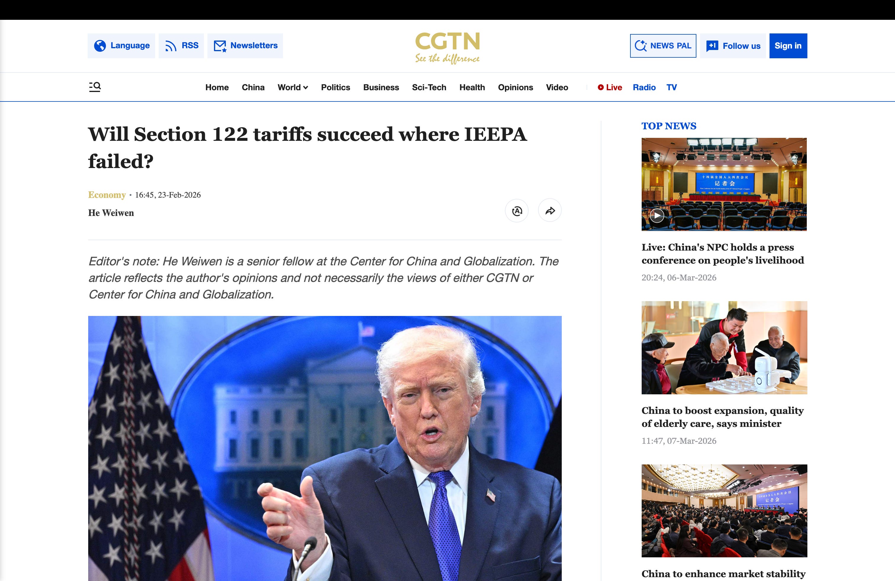 He Weiwen wrote on CGTN, “Will Section 122 tariffs succeed where IEEPA failed?“: