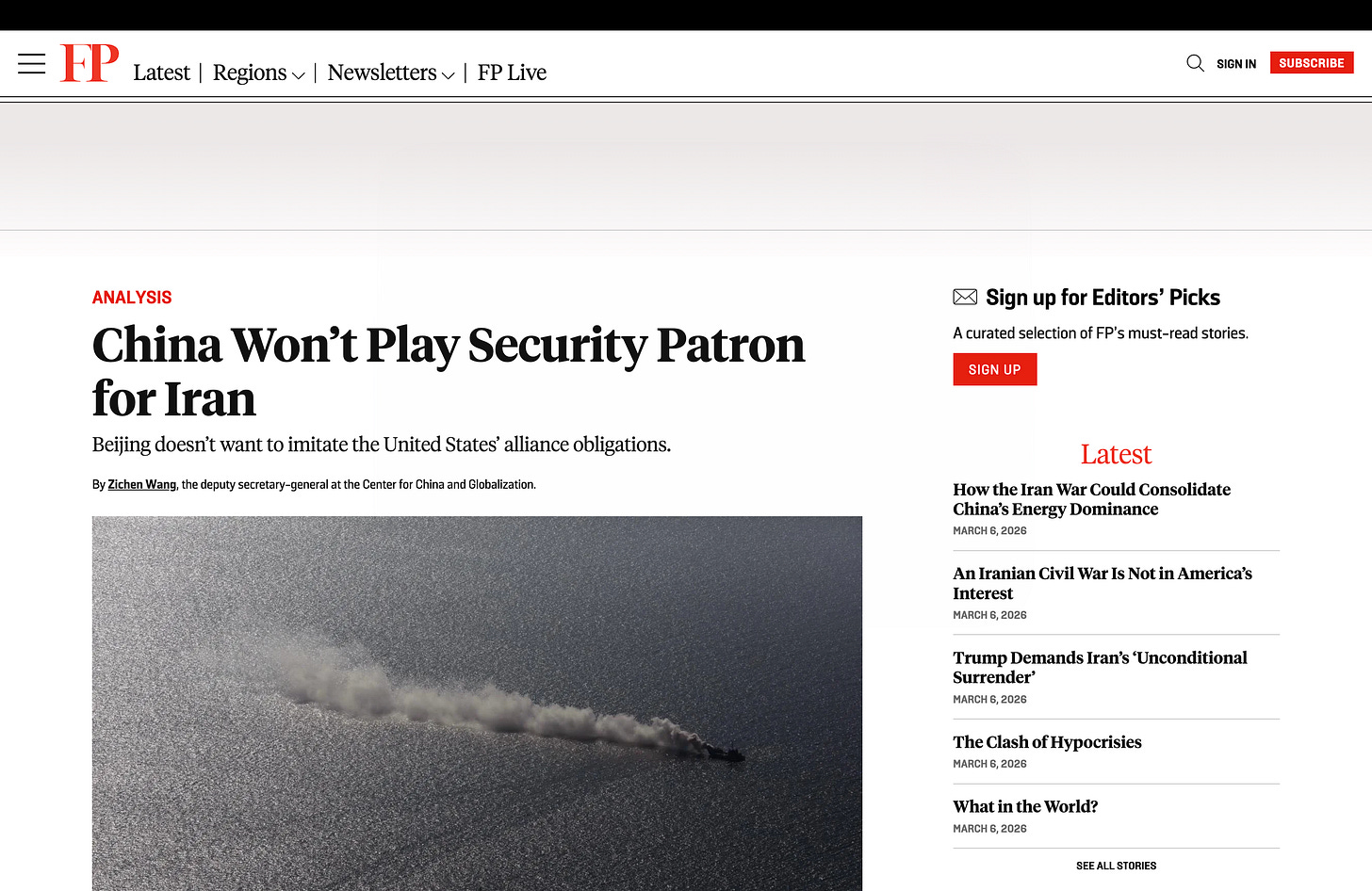 Zichen Wang, CCG Deputy Secretary-General, wrote on Foreign Policy, “China Won’t Play Security Patron for Iran“: