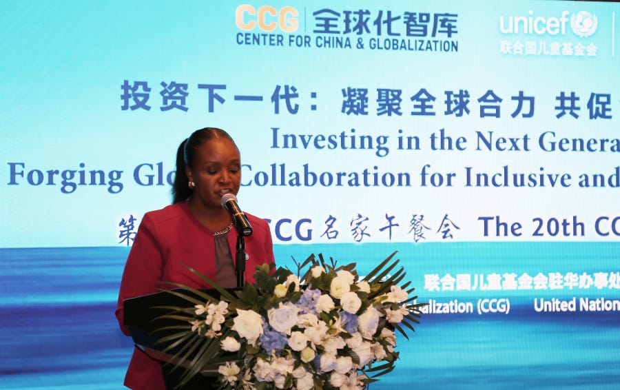 China’s opportunity is not only domestic; it is global. And UNICEF is working with China to share the lessons that have been learnt here through South–South and triangular cooperation. Let me give you a few quick examples. With China, we are working to support early childhood development programmes in Africa. With China, we are looking to expand public digital learning platforms—an initiative with the Ministry of Education to promote high-quality, inclusive national digital learning platforms for children in Africa. With China, we are expanding access and quality of maternal and child health services across Africa, Asia, and the Pacific, and setting up centres of excellence; there is one just about to go up in Ethiopia. With China, we are supporting technical and vocational education and mentoring linked to real labour markets. This includes funding, particularly from the China International Development Cooperation Agency (CIDCA), as well as practical, quality-assured, by-UNICEF technical exchanges and peer-to-peer learning that is rooted in results.