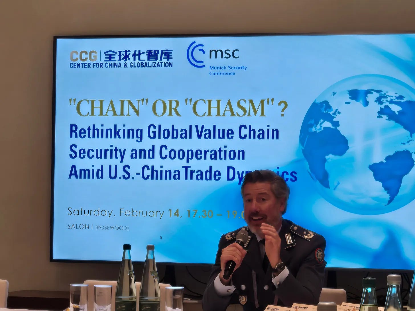 So, a warm welcome to this CCG side event. Today, we gather here in Munich at a time when the Munich Security Report 2026 has given us a title that sounds more like a warning than a theme: “Under Destruction.” So, the topic today is “Chain” or “Chasm”? Rethinking Global Value Chain Security and Cooperation Amid U.S.-China Trade Dynamics.