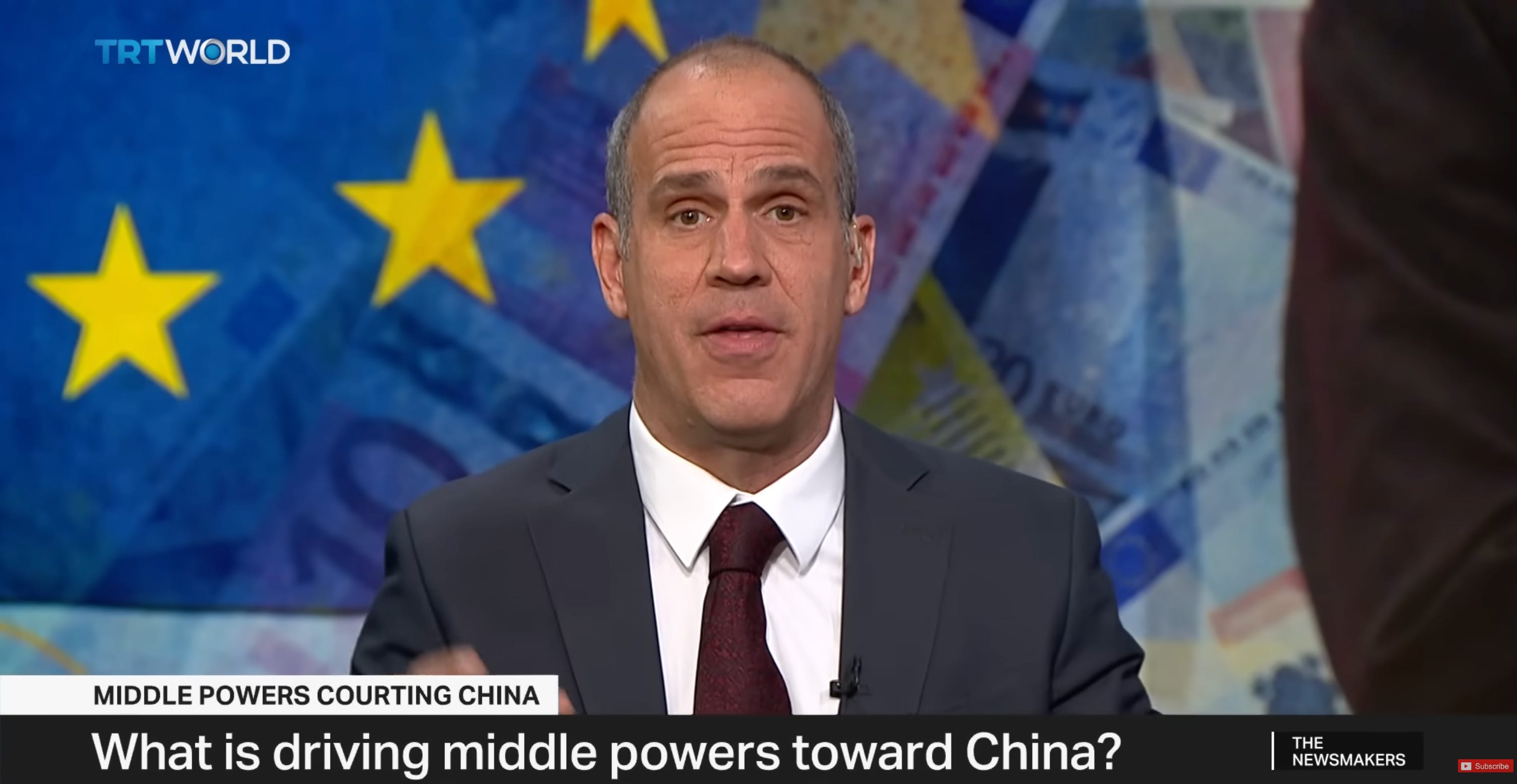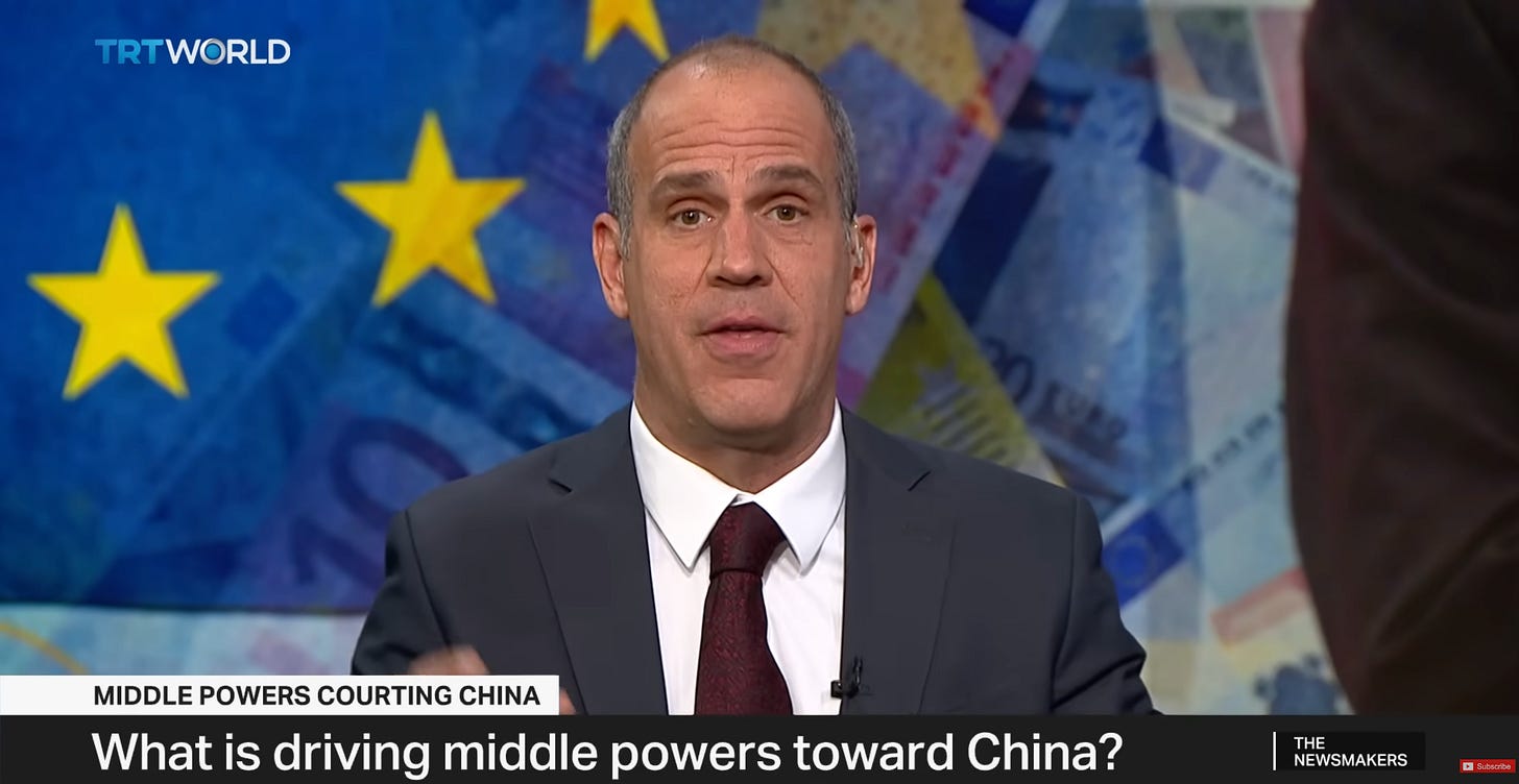 So that’s really what happened. They realised they had to safeguard their own interests for two reasons. First, they need China to keep prosperity, creating jobs and attracting investment. Second, they need China to help save this global system. You know, it’s crackling; it’s falling down, or falling apart. China is becoming a new anchor now. And those middle powers—of course, I think the EU will become, someday, you know, maybe ideologically and value-wise aligned with the U.S., but in economic and trade terms leaning towards China. It’s no longer black and white; it really has to be case by case.