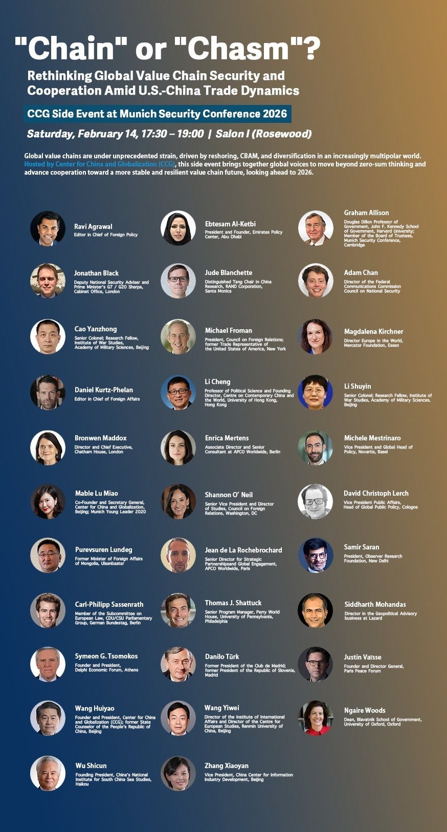 From 17:30 to 19:00 on Saturday, February 14, 2026, the Center for China and Globalization (CCG) will host an official side event at Salon I (Rosewood) during the 62nd Munich Security Conference (MSC).